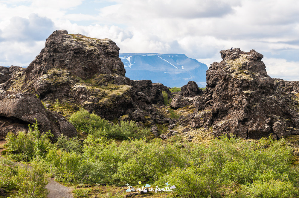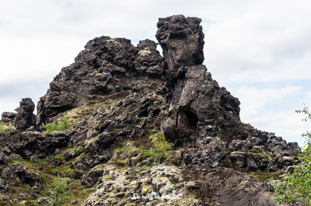 Así pues, uno de los primeros puntos de interés que encontramos por el camino, en dirección a Reykjahlíð, fue el campo de lava de Dimmuborgir, donde se pueden ver extraños pilares y colinas que se crearon hace más de 2000 años en una de las explosiones del volcán Hverfell, que se vislumbra perfectamente desde la zona.