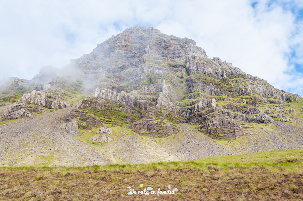 El último fiordo, Berufjördur, está flanqueado por picos de riolita y, por suerte, ahí fue donde nos empezó a salir un poco el sol. Lo agradecimos porque de repente empezaron a aparecer montañas espectaculares a nuestro lado.