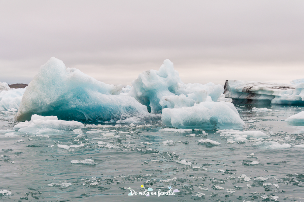 La única gran suerte que tuvimos ese día es que como el tiempo estaba nublado pudimos disfrutar mucho mejor de los colores de los icebergs y los reflejos. Si el cielo está claro es mucho más difícil ver las combinaciones de blancos, azules y negros. Eso sí, si vais por la mañana tened en cuenta que las corrientes marinas hacen que los icebergs bajen hasta la playa y es curioso ver como las olas los van deshaciendo hasta hacerlos desaparecer.